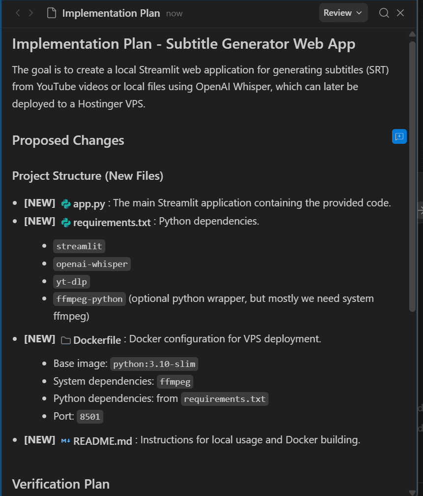 IMPORTANTE: No vayas como pollo sin cabeza diciendo a todo que sí. Aprende de cómo «razona» la IA. Para entendernos: debes ser capaz de entender el código aunque no lo hayas escrito y de saber la arquitectura que quieres crear: tipo de tecnologia (p.e. python), estructura de datos a crear para guardar la info generada, etc Por ejemplo en este proyecto es critico para ti para poder confiar en esta solucion conocer que es streamlit y ffmpeg y para qué sirven (no te lo cuento si no lo sabes para que investigues).
